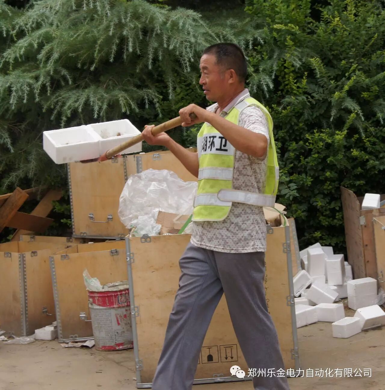 (环卫工正在清理废弃泡沫板)